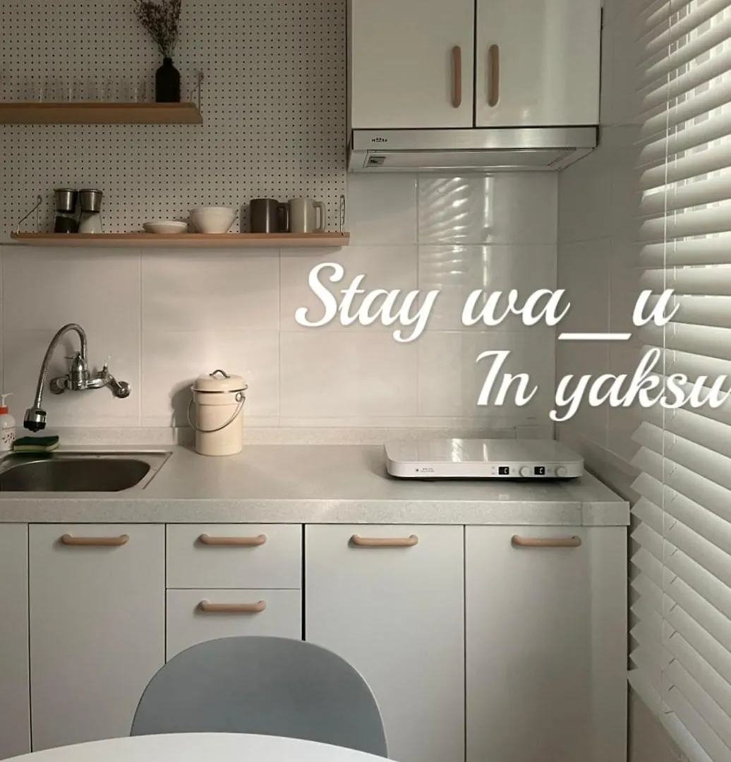 C'è anche un angolo cottura dotata di tutti i necessari utensili da cucina. L'appartamento Wa-U Stay #Yaksu Station Exit 2 Min #3Room è abbastanza vicino alla stazione degli autobus Jangchungcheyukgwan Front.